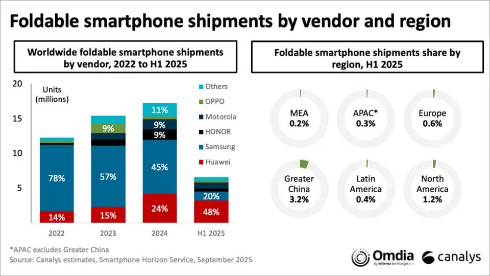 Canalys, през първата половина на 2025 г. Huawei контролира 48% от общите продажби на сгъваеми смартфони, докато Samsung заема само 20% от пазара.