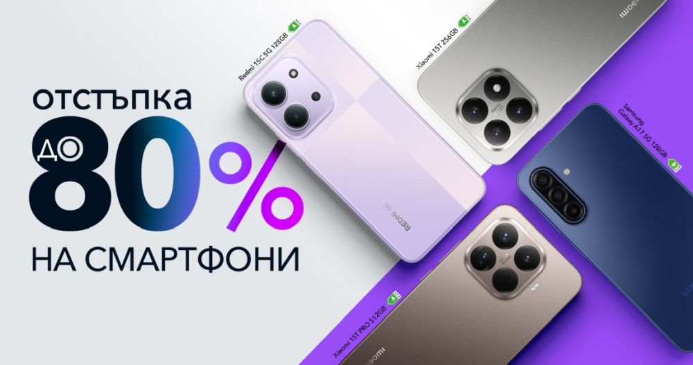 Vivacom представя специална селекция от 5G смартфони с отстъпка до 80% през октомври при сключване на 24-месечен договор за Unlimited план. Фокусът е върху Xiaomi 15T 5G, който се предлага в комплект с фотопринтер Xiaomi Photo Printer 1S. В кампанията влизат още избрани модели с атрактивни условия, включително Samsung Galaxy A17 5G и Motorola G86 5G.